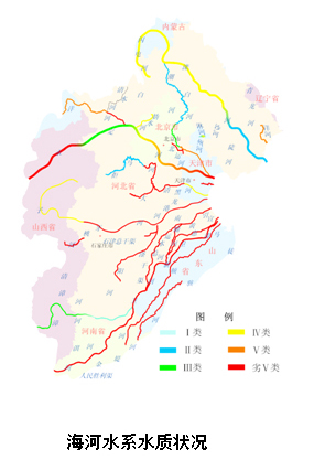 海河水系 水質(zhì)總體為重度污染。63個(gè)斷面中,Ⅰ~Ⅲ類水質(zhì)斷面占28.6%;Ⅳ類水質(zhì)斷面占14.3%、Ⅴ類水質(zhì)斷面占6.3%;劣Ⅴ類水質(zhì)斷面占50.8%。主要污染指標(biāo)為氨氮、五日生化需氧量和高錳酸鹽指數(shù)。