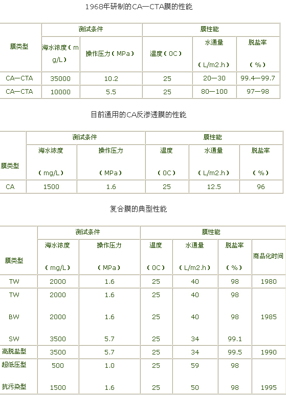Loeb和Sotrirajan于1960年制得了世界上第一高股鹽率,高通量,不對(duì)稱醋酸纖維素(CA)反滲透膜,其創(chuàng)新在于,以往的膜皆為均相致密膜(約0.lmrn厚),傳質(zhì)速度極底,無實(shí)用價(jià)值,而不對(duì)稱膜僅表皮層是致密的(約0.2m厚)就這一點(diǎn),是傳質(zhì)速度提高了近3個(gè)數(shù)量級(jí),表1給出了1968年研制的CA-CTA膜的性能。目前通用的CA反滲透膜多用于表面水處理,表2給出了其基本的膜性能。