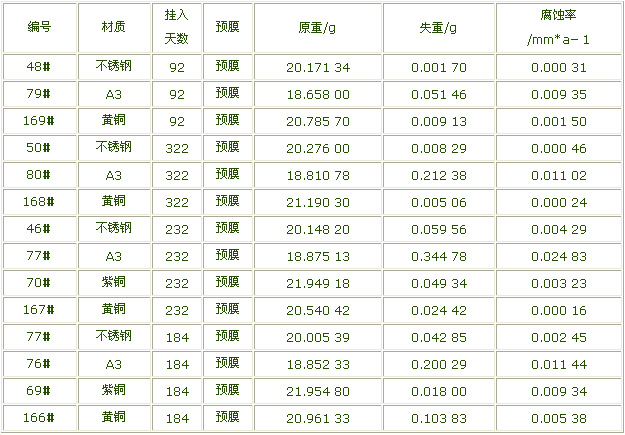 1)從腐蝕速率看,我們采用28 cm2的標準掛片掛入循環(huán)水系統(tǒng)中,經(jīng)過現(xiàn)場一段時間運行,測得的各種金屬材料的腐蝕情況見表4。