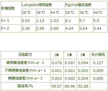 根據(jù)上述數(shù)據(jù),計算不同濃縮倍數(shù)和不同溫度下的Langelier飽和指數(shù)的Rgznar穩(wěn)定指數(shù),結果見表1。