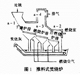 1) 爐排式(推料式)焚燒爐。其底部設(shè)有多段爐箅,垃圾堆放在爐箅上,一邊移動(dòng)一邊從爐箅下部吹入燃燒空氣,進(jìn)行干燥和直接燃燒。它的特點(diǎn)是:不必對(duì)入爐垃圾進(jìn)行分選、破碎,但對(duì)垃圾熱值有一定要求;只有1個(gè)燃燒室,固體垃圾在爐內(nèi)停留約l~3h,氣體在爐內(nèi)停留約幾秒鐘;垃圾層表面溫度800℃,煙氣溫度800~1000℃;爐型瘦高、體積較大、造價(jià)較高,爐排必須耐高溫、耐腐蝕、可運(yùn)動(dòng)并且有較好的機(jī)械性能。