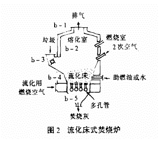 3) 流化床式焚燒爐。它利用鼓風(fēng)機(jī)和空氣輸送裝置向爐內(nèi)送入沸騰空氣,使載體砂子沸騰化。其特點(diǎn)是:垃圾懸浮燃燒,爐內(nèi)床料熱容量大,可燃燒熱值較低的垃圾;爐內(nèi)溫度均勻,垃圾停留時(shí)間長(zhǎng)、燃燒充分;與前兩種焚燒爐相比處理能力較小。