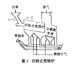 4) 回轉(zhuǎn)窯式工業(yè)垃圾爐。它由回轉(zhuǎn)窯本體、廢棄物供給裝置、二次燃燒爐、燒嘴等構(gòu)成,其特點(diǎn)是:適合處理大型垃圾和廢棄物(如污泥、塑料等);垃圾在回轉(zhuǎn)窯中回轉(zhuǎn)燃燒;回轉(zhuǎn)窯中溫度為900℃左右,二次燃燒爐溫度為1100~1200℃。