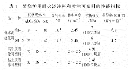 隨著垃圾焚燒技術(shù)向大型化!資源化和自動(dòng)化方向發(fā)展,焚燒爐用耐火材料也發(fā)生了一些變化。在日本,自70年代開(kāi)始,垃圾焚燒爐用耐火材料中耐火磚和不定形耐火材料基本上各占一半,其中,耐火磚以粘土磚、高鋁磚和一部分碳化硅磚為主,不定形耐火材料以粘土質(zhì)、碳化硅質(zhì)澆注料和可塑料為主。到了80年代,不定形耐火材料所占比例提高到75%左右,其中大部分為低水泥耐火澆注料或噴涂可塑料(性能見(jiàn)表1)。這是因?yàn)閭鹘y(tǒng)磚壁被帶水冷壁的熱能回收爐壁代替,而這種結(jié)構(gòu)復(fù)雜的水冷壁使用不定形耐火材料,施工簡(jiǎn)單,效果較好。此外,不定形耐火材料的整體性和氣密性較好,能更好地抵抗焚燒爐中的飛灰、廢氣、爐渣等對(duì)耐火材料的侵蝕。但對(duì)垃圾爐磨損侵蝕嚴(yán)重的部位(如推進(jìn)器側(cè)墻、爐底等),則使用致密剛玉磚或SiC質(zhì)耐火制品較為合適。