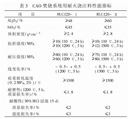 2) CAO焚燒系統(tǒng)用耐火材料.適用于焚燒爐不同部位的兩種牌號(hào)的耐火澆注料(性能見(jiàn)表3 ):FLCl20-I,用于一燃室爐墻、爐頂和二燃室非風(fēng)口部位;FLCl20-II,用于一燃室爐底,連接一、二燃燒室的喉管和二燃室燃油燒嘴及風(fēng)口處。該爐襯采用低水泥耐火澆注料(FLCl20-I!II)與高鋁纖維模塊的復(fù)合爐襯結(jié)構(gòu),這種結(jié)構(gòu)具有整體性能好、強(qiáng)度高、耐磨性和耐酸性好等特點(diǎn),特別是重量輕、保溫性能好且表面經(jīng)過(guò)硬化處理的全纖維模塊的采用,使這種新型爐襯的散熱損失和蓄熱損失大幅度降低。
