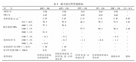 3) 回轉(zhuǎn)窯式工業(yè)垃圾爐用耐火材料。天津鋼管公司直接還原鐵廠,引進(jìn)英國(guó)Davy公司的兩條回轉(zhuǎn)窯生產(chǎn)線,其配套的全部耐火澆注料性能見(jiàn)表4.