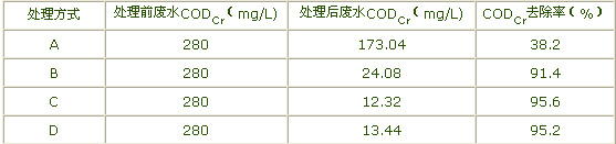 取含酚廢水水樣1L,置于底部鋪滿TiO2光催化劑的反應(yīng)器中,光距75mm,水樣pH為5.6,分A(TiO2+UV),B(TiO2+H2O2+UV),C(TiO2+H2O2+Fe3++UV),D(TiO2+H2O2+Cu2++UV)四種情況,比較CODCr去除率,其結(jié)果如表1所示。