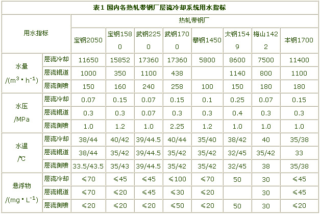 表1 國內(nèi)各熱軋帶鋼廠層流冷卻系統(tǒng)用水指標