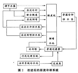 ②輥道冷卻及側(cè)噴需單獨設(shè)泵組及管道,因此可能會引起投資的增加。其實,這兩部分水無論是來自層流冷卻系統(tǒng)還是來自濁環(huán)水系統(tǒng)其動力消耗是一樣的,即運行費用一樣。層流增設(shè)了兩組泵但濁環(huán)系統(tǒng)的處理能力減小了,兩者相比設(shè)備費用變化不大。至于管道,雖增加了兩條獨立管道,但由于濁環(huán)供水系統(tǒng)中這兩用戶處于管道的末端,會使整個濁環(huán)管道均加上該部分轉(zhuǎn)輸流量,所以其管道費用并不省。另外,德國SMS(西馬克)公司也在這一點上進行了改進,即把層流輥道冷卻水水質(zhì)要求降低,與層流冷卻壓力、溫度、水質(zhì)都一樣,即可以將層流冷卻和層流輥道冷卻水合為一根管道供水,這樣層流輥道冷卻就不需要單設(shè)泵組和干管了。改進后的層流冷卻系統(tǒng)見圖2。