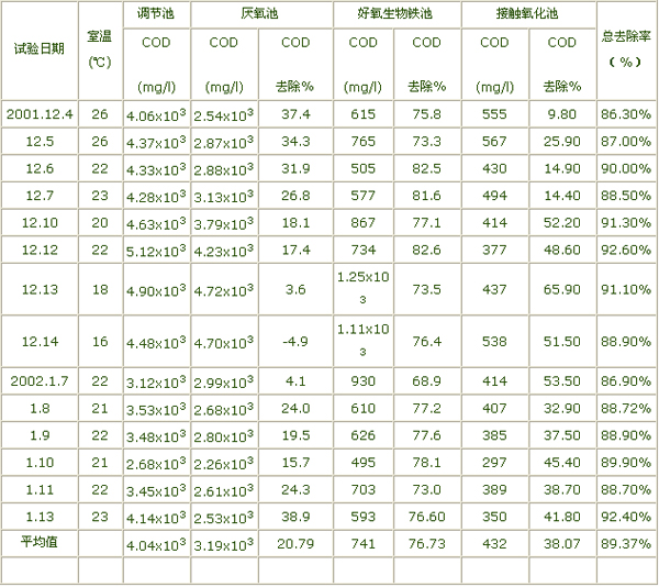 從表一的數(shù)據(jù)分析可見(jiàn),在室溫范圍20~26℃下,進(jìn)水CODcr濃度為2.68×103~5.12×103mg/l,平均進(jìn)水CODcr濃度為4.04×103mg/l,厭氧生物鐵出水CODcr平均濃度為3.19×103mg/l,平均CODcr去除率為20.79%;好氧生物鐵出水CODcr平均濃度為741mg/l,平均去除率為76.77%;接觸氧化池出水CODcr平均濃度為432mg/l,平均CODcr去除率為38.07%;全流程平均CODcr去除率為89.37%,進(jìn)水PH5~6,出水PH7~8。