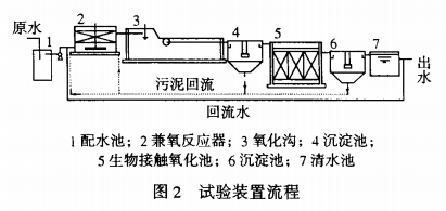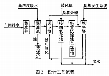 牛櫻、陳季華采用兼氧一好氧工藝處理香料廢水(圖2),該工藝中兼氧反應器采用上流式兼氧濾池,內掛盾式纖維填料,底部設有槳板式攪拌器,緩慢攪拌。二級好氧工藝采用氧化溝與生物接觸氧化池相結合的工藝,達到了深度處理的目的;最終處理出水部分回流,以降低進水濃度,減輕兼氧反應器有機負荷;沉淀池中的污泥回流到兼氧反應池進行水解酸化,可減少剩余污泥量,COD去除率達到了97%,BOD5去除率為99.2%,色度去除率為99.7%。該工藝中,厭氧出水水質對好氧處理系統(tǒng)處理效率有一定影響,整個好氧處理系統(tǒng)具有較強的抗沖擊負荷能力。曹衛(wèi)華[25]采用生物接觸氧化一臭氧氧化工藝處理山東某香料有限公司香料廢水,工藝流程見圖3。處理效率方面,前期(處理低濃度冷凝、冷卻水),對有機物的臭氧氧化率≥99%,去除有機物和氣味;第二期(處理含高濃度工藝廢水的混合廢水),生化裝置的CODer的去除率≥85%,出水達標排放。閆廣平等Lz6]采用了加壓生物氧化法處理香蘭素廢水,即在普通活性污泥法基礎上適當增加生化反應器中的壓力,從而使提供給微生物生化反應所需的氧成倍增加,反應速度快,去除率高,能耗低,特別適用于處理由于某些因素的影響無法采用厭氧法但具有可生化性的中高濃度有機廢水處理。Goronszy,M.C.采用催化化學氧化結合生物法處理香料廢水,進水COD23000mg/L,出水COD≤300mg/L,BOD≤175mg/L,SS≤250mg/L,運行效果良好。