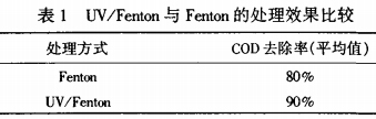 黃益宏進行了UV/Fenton法處理高濃度香料廢水,試驗表明,pH,H2O2投加量,F(xiàn)e2投加量,光照反應時間均會對處理效果產(chǎn)生極大的影響。由表1可見,UV/Fenton法比單獨使用Fenton法效果好很多,主要是光助下H2o2的分解速率遠大于單獨使用Fe2催化H2O2的分解速率。
