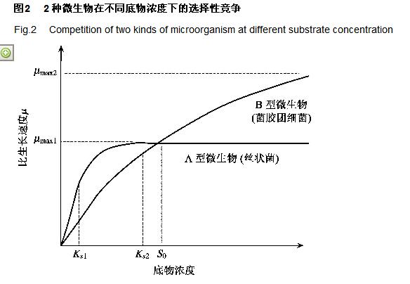 在絲狀菌與菌膠團(tuán)菌共生的系統(tǒng)中,由于絲狀菌具有較低的Ks 和μmax ,則其Smin值較小,因而絲狀菌的存在保證獲得低濃度的出水水質(zhì),從而保證凈化效率。