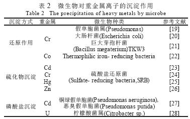 微生物對重金屬離子的沉淀作用,一般認為是由于微生物對金屬離子的異化還原作用或是由于微生物自身新陳代謝的結(jié)果。一方面,一些微生物可分泌特異的氧化還原酶,催化一些變價金屬元素發(fā)生氧化還原反應,或者其代謝產(chǎn)物或細胞自身的某些還原物直接將毒性強的氧化態(tài)的金屬離子還原為無毒性或低毒性的離子;另一方面,一些微生物的代謝產(chǎn)物(硫離子、磷酸根離子)與金屬離子發(fā)生沉淀反應,使有毒有害的金屬元素轉(zhuǎn)化為無毒或低毒金屬沉淀物(表2)。