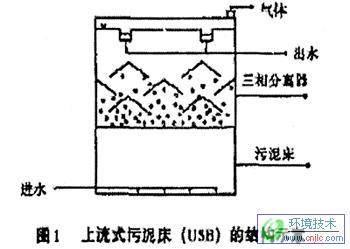 上流式污泥床(USB)是20世紀70年代末由荷蘭Lettinga開發(fā)的又一項新的顆粒型生物膜反應器,主要用于厭氧生物處理系統(tǒng)中,即UASB。它主要由配水系統(tǒng)、污泥床、三相分離器等組成。反應過程中產生的氣體將污泥和污水進行充分混合,三相分離器將顆粒污泥、氣體和污水進行分離,污泥保留在反應器中,氣體和處理后的出水排出反應器,其結構示意見圖1。