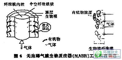 無泡曝氣生物反應器(Membrane Aeration Bioiflm Reactor),簡稱為MABR,由中空纖維膜填料部分和水流部分組成。生物膜所需要的氧氣是通過纖維束填料供給的,中空纖維膜不僅起著供氧作用,同時又是固著生物膜的載體。圖 4為無泡曝氣膜生物反應器處理污水原理圖。即,純氧或空氣通過中空纖維膜的微孔為生物膜進行無泡曝氣.在中空纖維膜的外側形成的生物膜與污水充分接觸.污水中所含的有機物被生物膜吸附和氧化分解.從而使污水得到凈化。