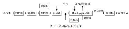 原污水進入格柵間,在此攔截污水中漂浮物,由污水泵提升,經(jīng)細格柵進一步去除水中雜質(zhì),進入沉砂池去除砂粒,然后進入Bio-Dopp反應器的曝氣池,去除COD、BOD5、N、P等污染物,混合液經(jīng)沉淀分離,澄清液進入消毒池消毒后排入泗塘河,沉淀污泥隨回流混合液由空氣氣提器提升至曝氣池內(nèi)循環(huán),剩余污泥(泥齡約20d),由污泥泵送至脫水機房處理后,泥餅外送。工藝流程見圖1。
