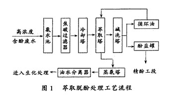 萃取后的含酚廢水由萃取塔排出,經(jīng)蒸氨脫除部分氨,再與其它廢水混合,進(jìn)入隔油池除油,然后經(jīng)過調(diào)節(jié)池調(diào)節(jié)水質(zhì)水量后,進(jìn)入生化處理流程。