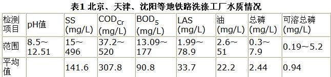 由于目前尚無比較全面的洗滌廢水水質(zhì)資料,故委托北京、天津、沈陽等地的衛(wèi)生防疫站或環(huán)境監(jiān)測站對當(dāng)?shù)氐南礈鞆U水進(jìn)行了水質(zhì)檢驗(yàn),其水質(zhì)情況見表1。