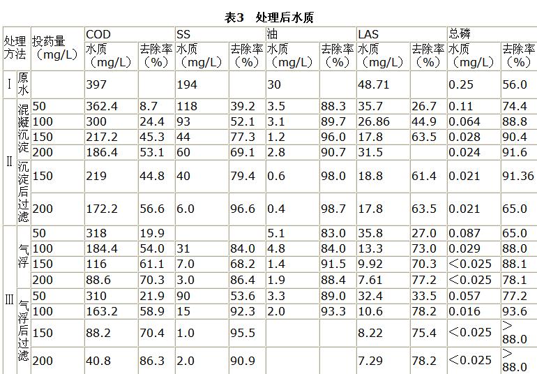 不同投藥量下,廢水分別經(jīng)混凝沉淀、氣浮、過濾處理后,各項(xiàng)水質(zhì)指標(biāo)及去除率詳見表3(混凝劑為堿式氯化鋁)。
