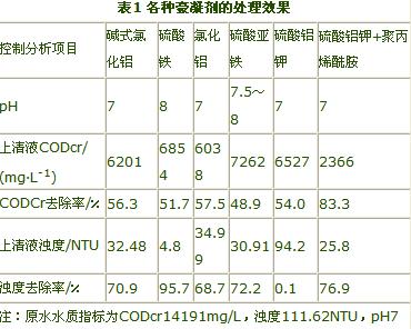 各種絮凝劑的用量為2mL,試驗(yàn)溫度為22~29℃,取絮凝處理后的上清液,測(cè)定CODcr及濁度,結(jié)果見表1。