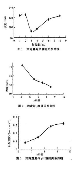 從圖2中可以看出,隨著pH值的增大,上清液濁度減小,最佳pH值為9左右。而且從圖3可以看出pH值增大時(shí),沉淀速度加大。