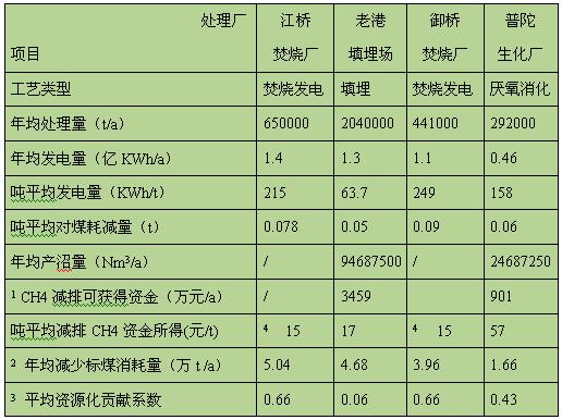 由上述表格可以看出:不同工藝的垃圾處理,對節(jié)能減排個體和總體指標的影響是不同的。主要如下: