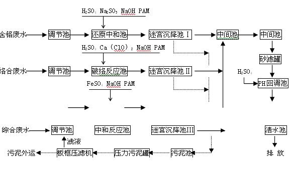 含鉻廢水,絡(luò)合廢水,綜合廢水分別進(jìn)入各自的調(diào)節(jié)池均質(zhì)。