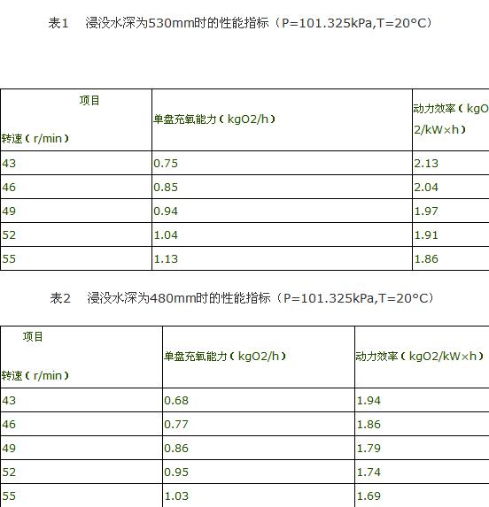 單盤標(biāo)準清水充氧能力及動力效率見表1~2所示:
