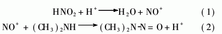 亞硝化作用是指在亞硝酸鹽的酸化過程中產生亞硝酰陽離子或類似的含氮化合物(如N2O3),然后該亞硝酰陽離子與胺(如二甲胺(DMA))發(fā)生反應生成NDMA (見式(1)和式(2))。