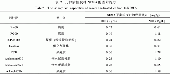 如表2所示, NDMA的平衡濃度分別為100μg/L和500μg/L時,活性炭對NDMA的吸附能力很低。
