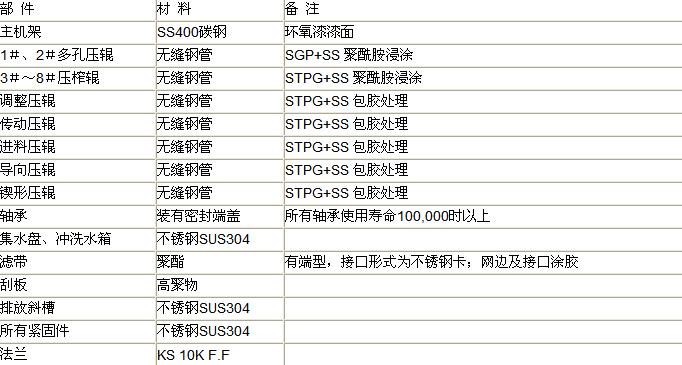 以下是帶壓機主要部件的材料清單,其它零部件的材質(zhì)均與之配套。材料的技術(shù)要求采用日本JIS標準。