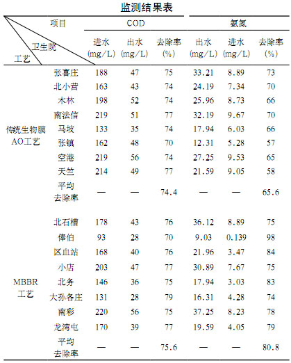 以北京市順義區(qū)各鄉(xiāng)鎮(zhèn)衛(wèi)生院為例。該衛(wèi)生院產(chǎn)生的醫(yī)療廢水多為生活污水,處理水量為25~50m3/d,2005年至2007年針對(duì)順義區(qū)的張喜莊、北小營(yíng)、木林、南法信、馬坡、張鎮(zhèn)、空港、天竺、北石槽、俸伯、區(qū)血站、小店、北務(wù)、大孫各莊、南彩、龍灣屯等衛(wèi)生院的污水進(jìn)行了處理,其中前八個(gè)衛(wèi)生院采用傳統(tǒng)生物膜AO工藝,后八個(gè)單位采用MBBR工藝。工藝前端均設(shè)格柵和調(diào)節(jié)池,后端采用豎流式沉淀池和二氧化氯消毒。使用傳統(tǒng)生物膜AO工藝的污水處理站中的A池水力停留時(shí)間為4h,O池水力停留時(shí)間為6h,回流比100%,彈性填料填充比75%,氣水比15∶1。采用MBBR工藝的兩個(gè)曝氣池總停留時(shí)間為7h,不設(shè)回流,采用φ20×20(mm)柱狀改性聚乙烯懸浮填料,比表面積510m2/m3,填充比50%,氣水比10∶1,其中第二個(gè)反應(yīng)池間斷曝氣。反應(yīng)池采用下布水,池底設(shè)微孔曝氣管進(jìn)行曝氣,出水設(shè)活動(dòng)?xùn)虐濉?005年12月和2007年1月經(jīng)順義區(qū)環(huán)境保護(hù)局環(huán)境監(jiān)測(cè)站監(jiān)測(cè),監(jiān)測(cè)結(jié)果見(jiàn)下表: