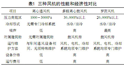 將污泥堆肥工程常用的離心通風(fēng)機(jī)與污水處理工程曝氣系統(tǒng)常用的多級(jí)離心鼓風(fēng)機(jī)、羅茨風(fēng)機(jī)進(jìn)行性能和經(jīng)濟(jì)性對(duì)比見表1。