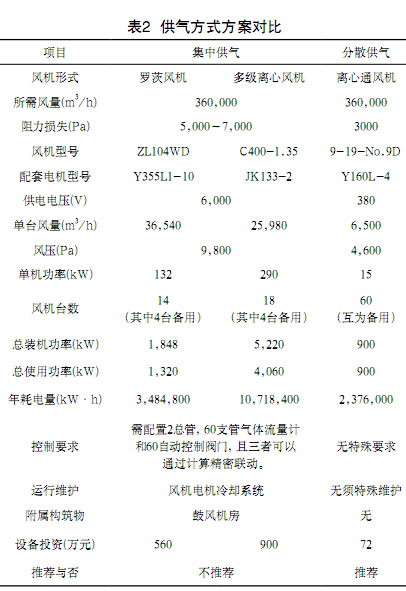 此外,在風(fēng)機(jī)選型中,每小時(shí)數(shù)萬立方米風(fēng)量、幾千帕風(fēng)壓的參數(shù)對(duì)于羅茨或離心風(fēng)機(jī)的選型都十分困難,且運(yùn)行工況處于極低效率區(qū)域,裝機(jī)功率大大增加,若選擇大型離心通風(fēng)機(jī),會(huì)由于集中供氣較為復(fù)雜的管路系統(tǒng),使得壓力無法滿足工藝要求。