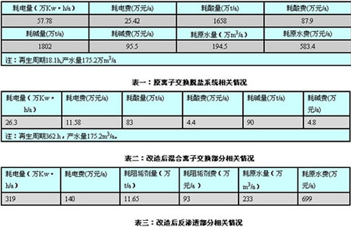對(duì)同一種原水,離子交換脫鹽系統(tǒng)與反滲透+混合離子交換脫鹽系統(tǒng)的制水成本是不同的。該公司自備電廠原離子交換脫鹽系統(tǒng)為復(fù)床(強(qiáng)酸氫型陽(yáng)離子交換器+強(qiáng)堿氫氧型陰離子交換器)+混合離子交換器,產(chǎn)水能力為200m3/h,系統(tǒng)進(jìn)水含鹽量為630mg/L。2001年10月引入反滲透技術(shù),形成反滲透+混合離子交換脫鹽系統(tǒng),F(xiàn)將系統(tǒng)改造前后相關(guān)運(yùn)行情況及制水成本分別列于表1,表2,表3(表中物料的價(jià)格以32%的HCl530元/t,31%的燒堿530元/t,電費(fèi)0.44元/(kW•h),原水3元/m3,阻垢劑8萬(wàn)元/t計(jì))。