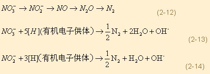 反硝化作用是指在厭氧或缺氧(DO<0.3-0.5mg/L)條件下,NOx―-N及其它氮氧化物被用作電子受體被還原為氮?dú)饣虻钠渌鼩鈶B(tài)氧化物的生物學(xué)反應(yīng),這個(gè)過程由反硝化菌完成[3--4]。反應(yīng)歷程為: