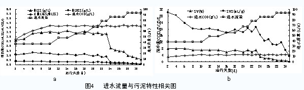 由試驗(yàn)結(jié)果知(圖4),進(jìn)水COD穩(wěn)定在4200mg/L左右,隨著進(jìn)水流量的增加,微生物活性指標(biāo)SV、MLSS、MLVSS、SVI和f(MLVSS/MLSS)等有如下變化規(guī)律(表4~6):