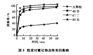 活性炭對(duì)氰化物的去除率如圖5所示。80目的去除率為100%,柱狀活性炭的去除率最低。80目、60目、40目的處理效果在1h后非常接近。