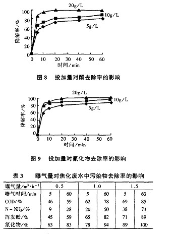 對(duì)焦化廢水中COD、氨氮、酚和氰化物的去除率比不曝氣有明顯的提高,氨氮和氰化物受其影響更為明顯。曝氣分散活性炭技術(shù)是處理焦化廢水的有效方法。