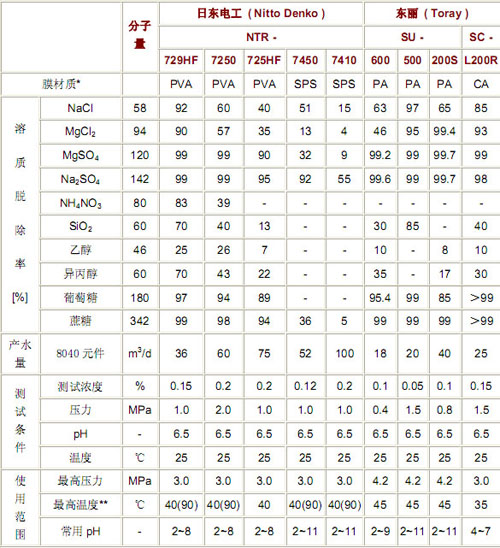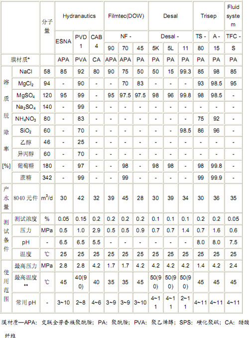 鑒于國內(nèi)許多科研及使用單位對(duì)納濾膜不如反滲透膜那樣熟悉,現(xiàn)將國外主要的納濾膜及其性能列于表3 和表 4,以供參考。