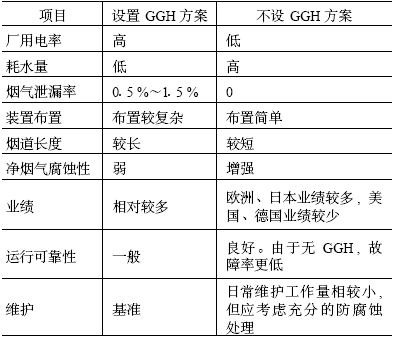 由以上技術(shù)方案比較可以看出: 不設(shè)GGH方案廠用電耗低、無煙氣泄漏, 布置簡(jiǎn)單, 煙道長(zhǎng)度短, 但耗水量大, 出現(xiàn)腐蝕問題的可能性相對(duì)較大。