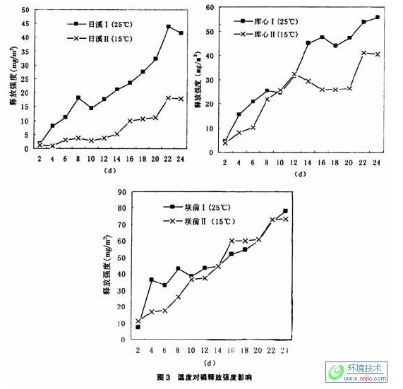 在厭氧條件下,磷有較明顯釋放現(xiàn)象發(fā)生,而且溫度的升高促進了底泥中磷的釋放。水庫三個底泥樣品中總磷在15℃下釋放速度平均值為1.996mg/m2·d,25℃下平均值為2.873mg/m2·d,說明水庫底泥中大量的磷的釋放是水體富營養(yǎng)化又一個重要原因。