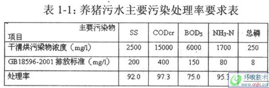 由于歷史原因,目前大部分養(yǎng)豬場(chǎng)建在河邊、溪邊、湖邊、海邊,無(wú)論是直沖式養(yǎng)豬場(chǎng)還是干清糞養(yǎng)豬場(chǎng),污水均直排水體,造成水體嚴(yán)重污染。養(yǎng)豬場(chǎng)排放規(guī)律為間歇式,每天上、下午各一次,排放量大、沖擊負(fù)荷大。從污水成份分析,固液混雜,屬高有機(jī)、高氮、高磷污水,且碳氮比例失調(diào),這些特點(diǎn)給養(yǎng)豬污水處理帶來(lái)很大困難。從表1-1可清楚看出,干清糞養(yǎng)豬場(chǎng)污水主要污染物排放情況按GB18596-2001《畜禽養(yǎng)殖業(yè)污染物排放標(biāo)準(zhǔn)》衡量,CODcr,NH3-N、TP處理率必須達(dá)到97.3%、95.3%、96.8%,目前無(wú)論物理、物化、化學(xué)、生化、生態(tài)等處理方法中,不可能用一種或二種處理方法來(lái)實(shí)現(xiàn)達(dá)標(biāo),這樣就決定了養(yǎng)豬場(chǎng)污水處理必須采取多方法組織工藝。