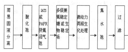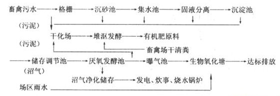 國(guó)家農(nóng)業(yè)部2001年出臺(tái)的畜禽養(yǎng)殖業(yè)能源環(huán)保站設(shè)計(jì)規(guī)范’(征求意見稿)中提出畜禽養(yǎng)殖業(yè)污水處理的兩種方式,即“環(huán)保型”和”生態(tài)型”。規(guī)范中對(duì)“環(huán)保型”處理方式工藝要求如圖2-1。