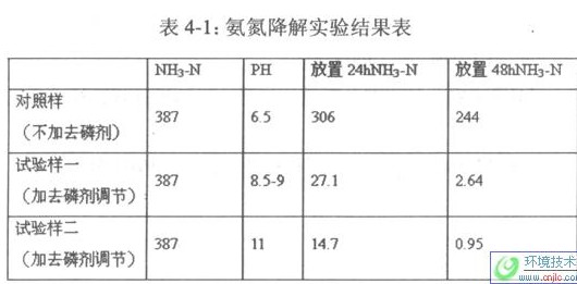 加去磷劑調(diào)整PH,并放置一定時(shí)間,測(cè)定NH3濃度,結(jié)果見表4—1。