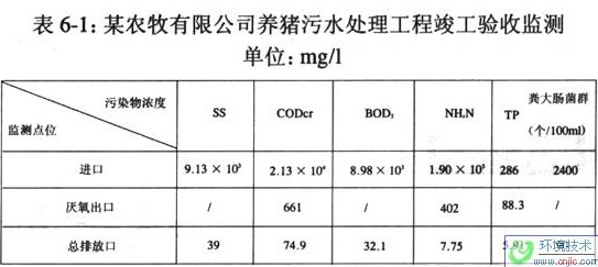 年出欄菜豬1萬(wàn)頭,2001年投資90多萬(wàn)元建成環(huán)保處理設(shè)施,但是處理效果非常差,厭氧沼氣池總?cè)コ蔬不到50%,沼氣無(wú)法回收。2004年對(duì)此進(jìn)行改造,采用PAFR工藝和方案一工藝,改造后設(shè)施運(yùn)行正常,經(jīng)監(jiān)測(cè)表明各項(xiàng)污染物排放均達(dá)標(biāo),監(jiān)測(cè)結(jié)果見表6一l。