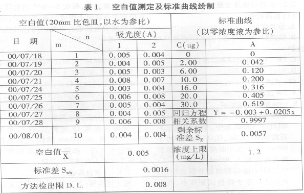 分取0.O,1.00,3.oo,5.00,8.00,10.00,15.00ml磷酸鹽標(biāo)準(zhǔn)使用液于消解罐中,按2.3.1--2.3.3步驟操作,得一標(biāo)準(zhǔn)曲線如下表,空白試驗(yàn)每日做兩個(gè)平行,累積10天數(shù)據(jù)如下表。