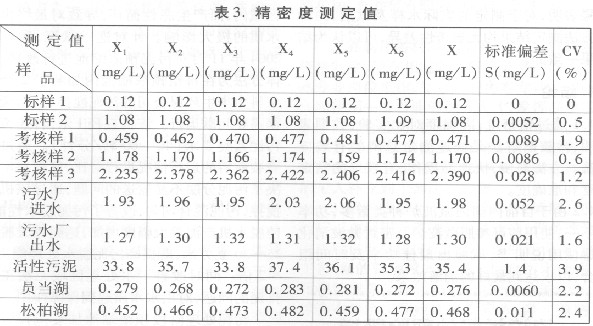 為了檢驗(yàn)微波消解法的準(zhǔn)確度,分別取環(huán)境臨測(cè)總站考核樣、磷酸二氫鉀標(biāo)準(zhǔn)深液,污水廠各工藝段水樣以及湖泊水樣進(jìn)行實(shí)驗(yàn),結(jié)果見表2。