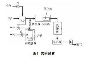 經(jīng)過(guò)燃燒實(shí)驗(yàn)測(cè)得煙氣中的NOx濃度為126ppm,砷濃度為11.93ppm,使煙氣以100~200m3 /h的速度通過(guò)尺寸為50×30×1(mm)的V2O5/TiO2催化劑,NH3/NOx為 1.0,反應(yīng)溫度控制在350℃,反應(yīng)時(shí)間62小時(shí)。實(shí)驗(yàn)裝置如圖1所示。